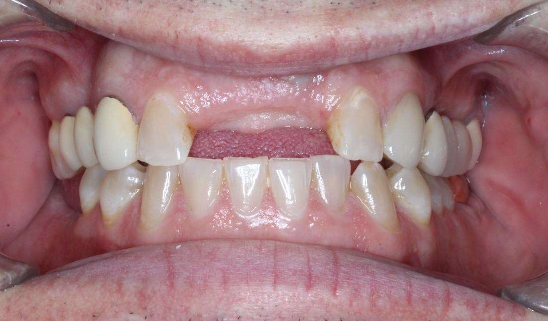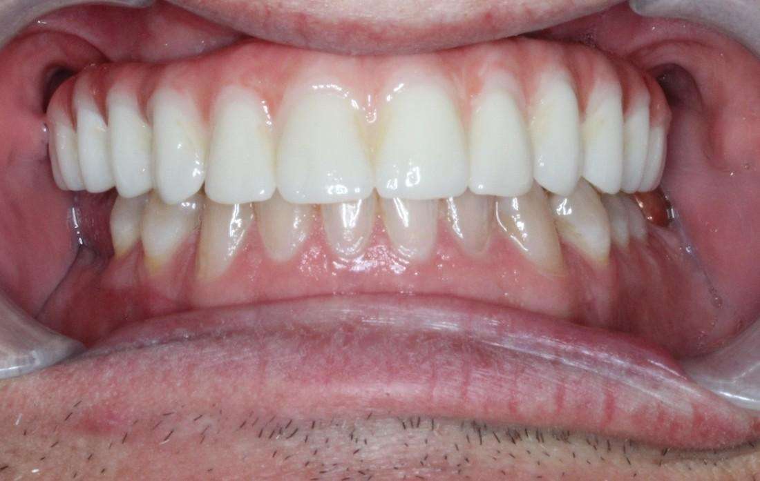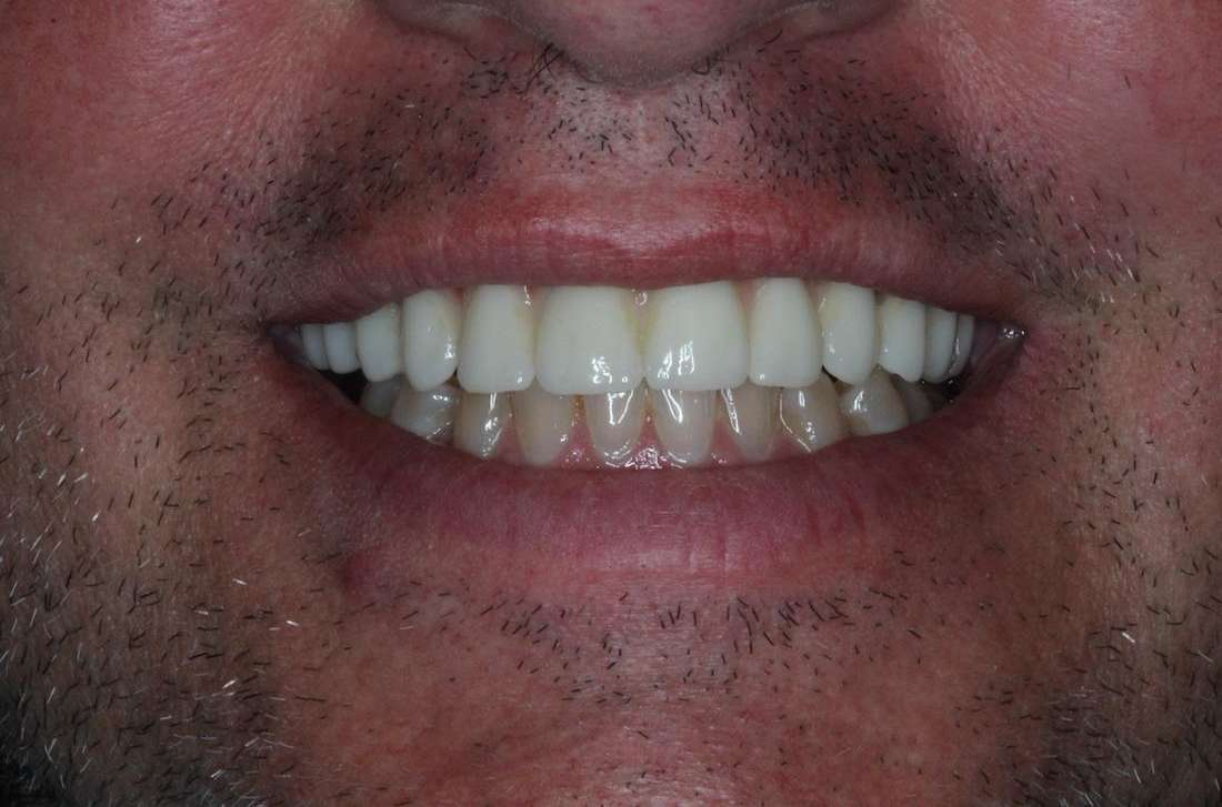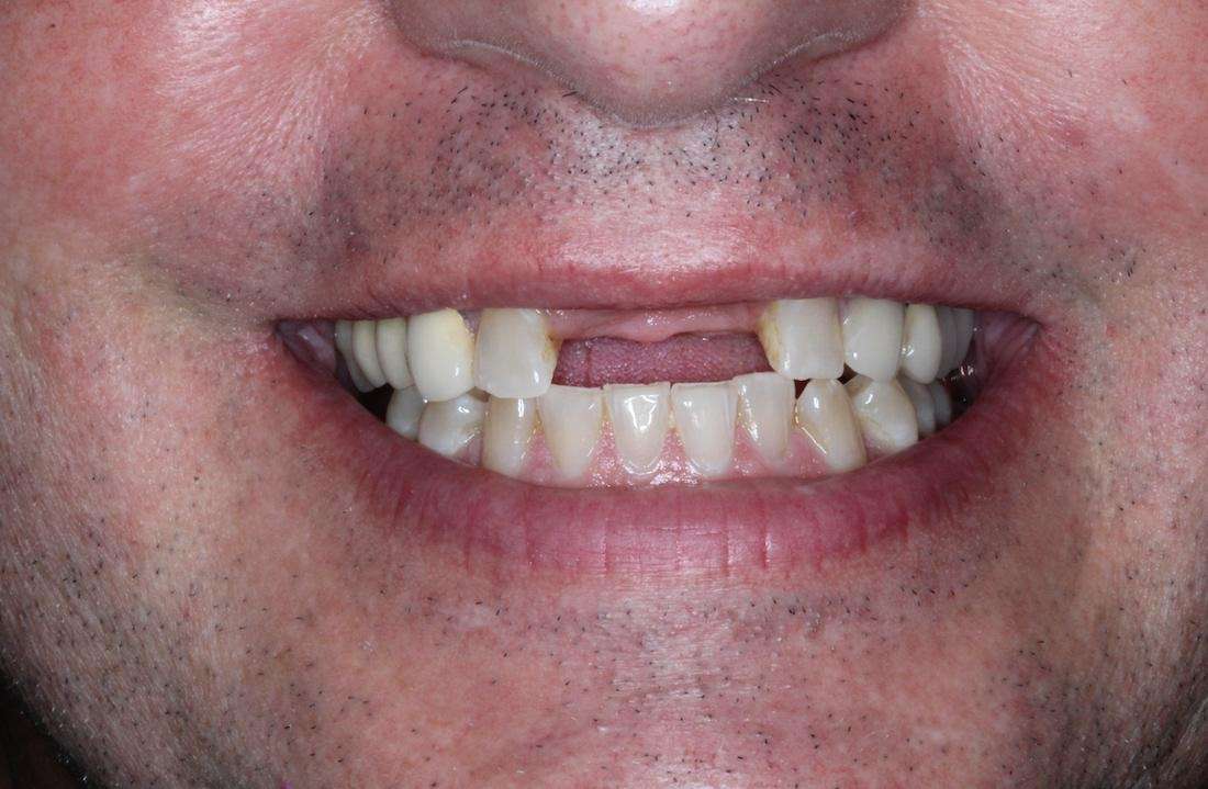 This patient lost his two front teeth, resulting in a large and unsightly gap in the center of his smile. However, his other teeth and dental restorations were healthy, white, and properly aligned. Rather than replace each of his missing teeth with an individual implant, we replaced his upper front teeth with a single all-on-x implant-retained restoration, into which multiple implants were screwed.